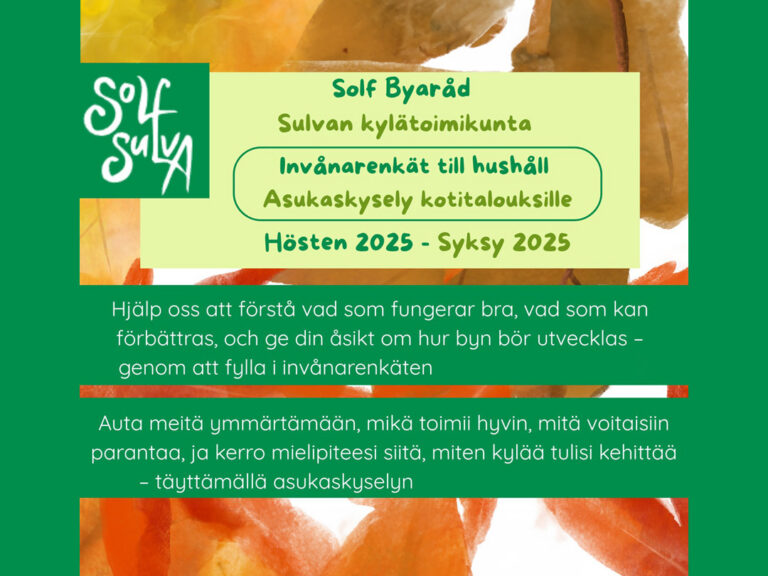 Solf Byaråd reviderar Byautvecklingsplanen. Den nuvarande går ut nu 2025. Fyll i enkäten och hjälp oss att förstå vad som behöver utvecklas i vår by: Enkäten…